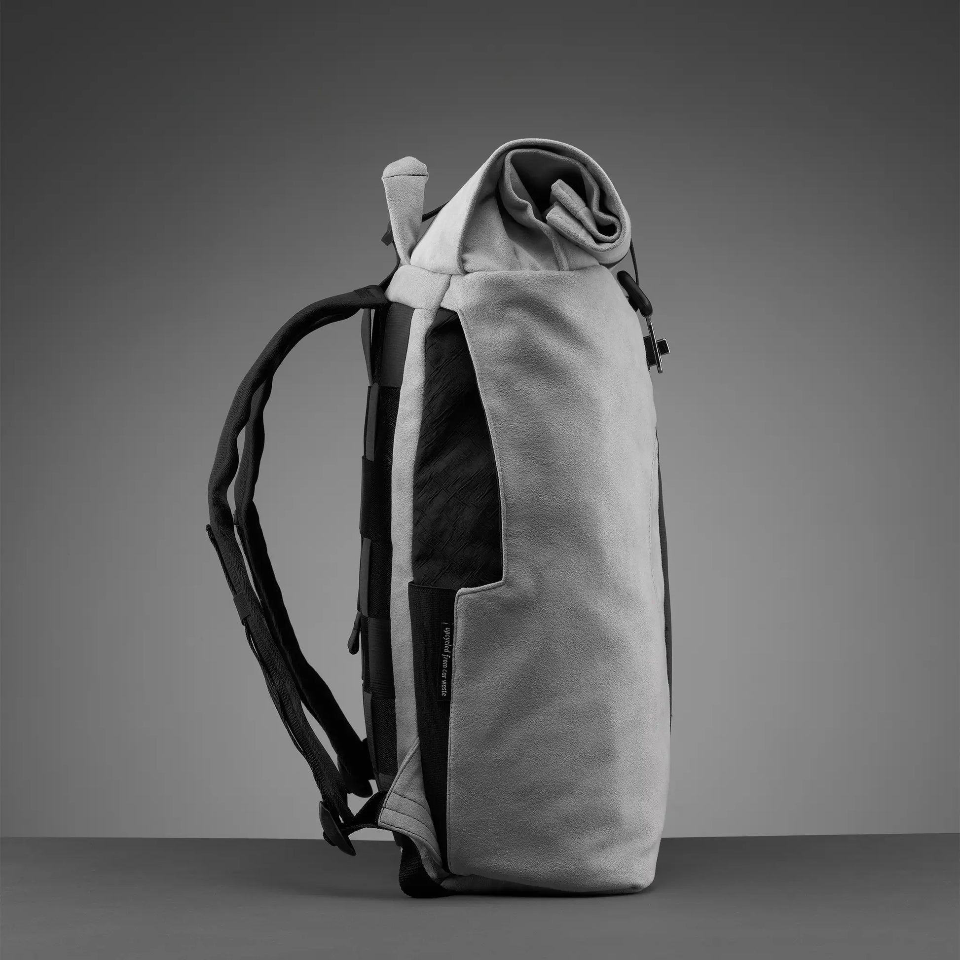 Dieser Rolltop ist unser bisher hochwertigstes Modell und verbindet zeitloses Design mit innovativem Upcycling. Gefertigt aus Ultrasuede – einem veganen, hochwertigen Lederimitat aus der Welt der Luxusautos – vereint er Eleganz und Umweltbewusstsein.